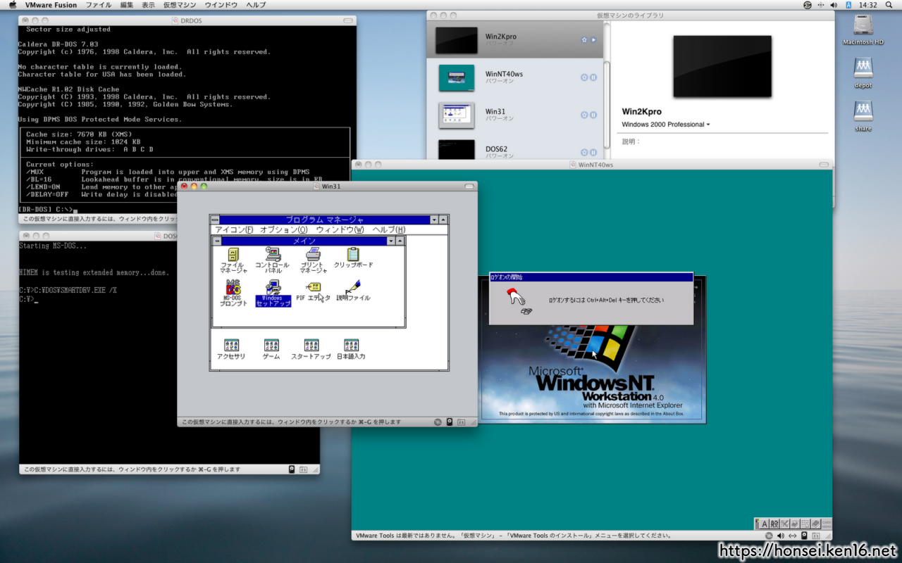 上のスクリーンショットは、左上がDR-DOS(笑)、左下がMS-DOS、中央がWindows 3.1、右下がWindows NT 4.0だ。(右上はVMware Fusionの管理ウィンドウ)