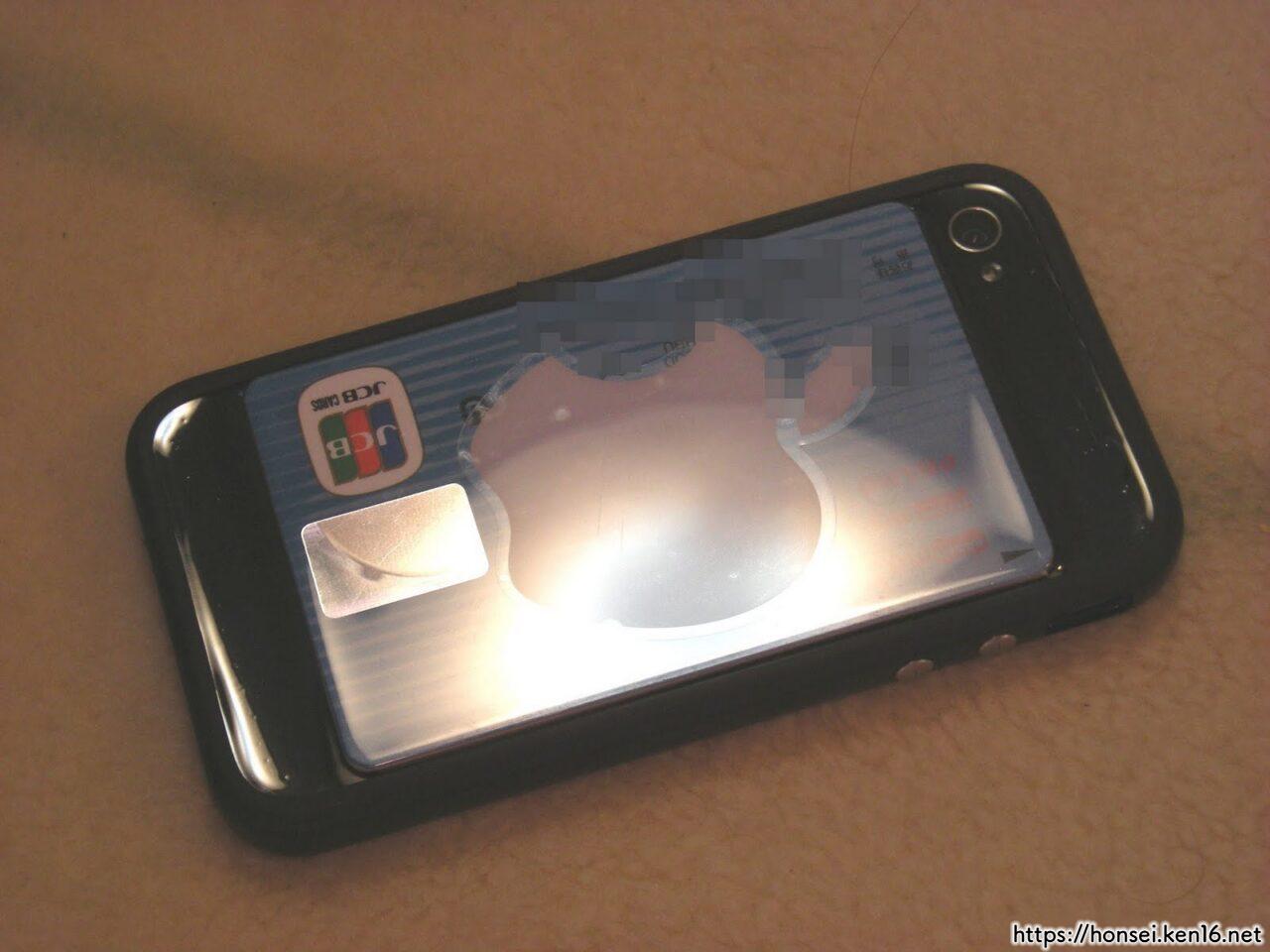 せっかく貰ったことだし、モノはいいので(今まで買ったガワは皆部品点数1点とシンプルだったのに、純正バンパーは何ですかコレ。部品点数10コぐらいあるんじゃないかしら。ちゃんと剛の部分と柔の部分とで素材変えてる・・・)、有効利用する方法はないかと考えるわけですよ。私としては、もうICカードがついてない状態に戻るのは論外だし、かといってバンパーは裏面はiPhone 4の素のまま、むき出しにするタイプだから、ICカードを挟めないし・・・と思ってしばらく放置していたのですが、ふと思いつきました。バンパーでは裏側が覆われていないからICカードを挟めないのなら、裏側を何かで覆って、それでICカードを挟んでやればよくないかしら?